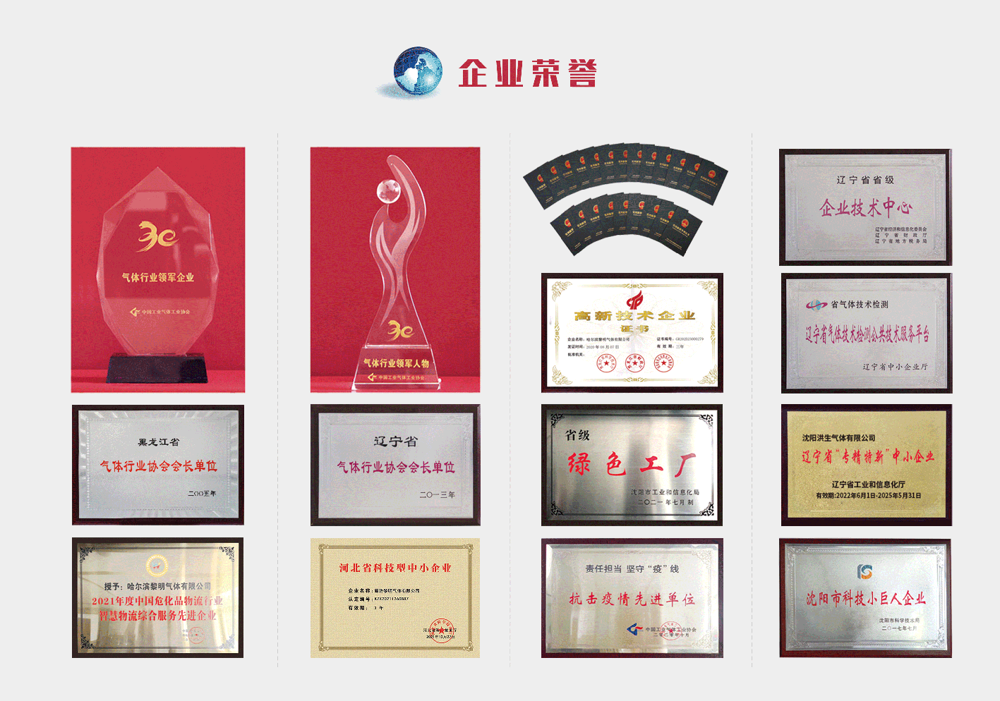 榮譽鑒證實力,實力鑄就輝煌。黎明氣體集團秉承“嚴格、求實、誠信、創新”的企業精神,以“真誠服務共發展”的經營理念,贏得了廣大用戶的認可信賴和社會各界的普遍贊譽。集團與所屬企業先后獲得中國氣體行業領軍企業、省級綠色工廠、專精特新中小企業、科技小巨人企業、科技型中小企業、中國危化品物流行業安全管理先進企業、全國氣體行業抗擊疫情先進單位等榮譽稱號。